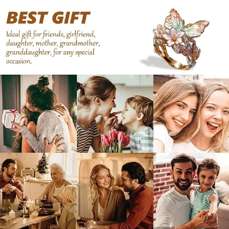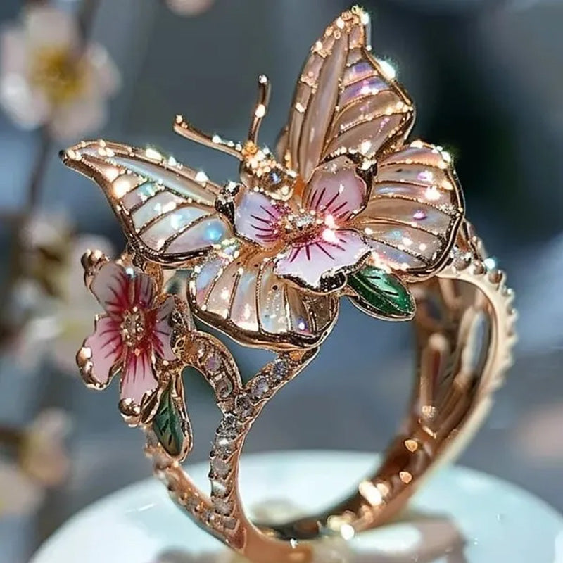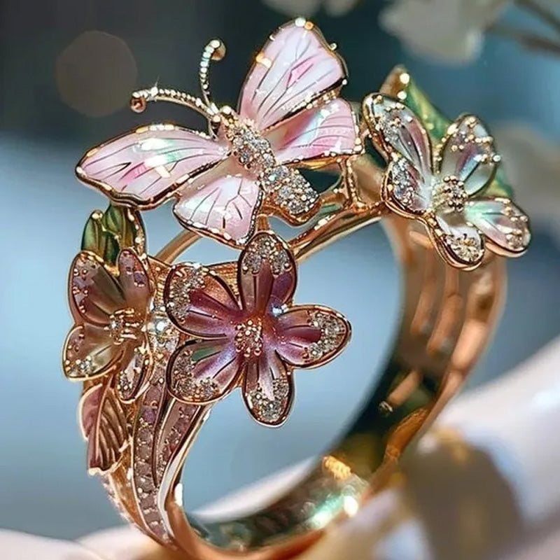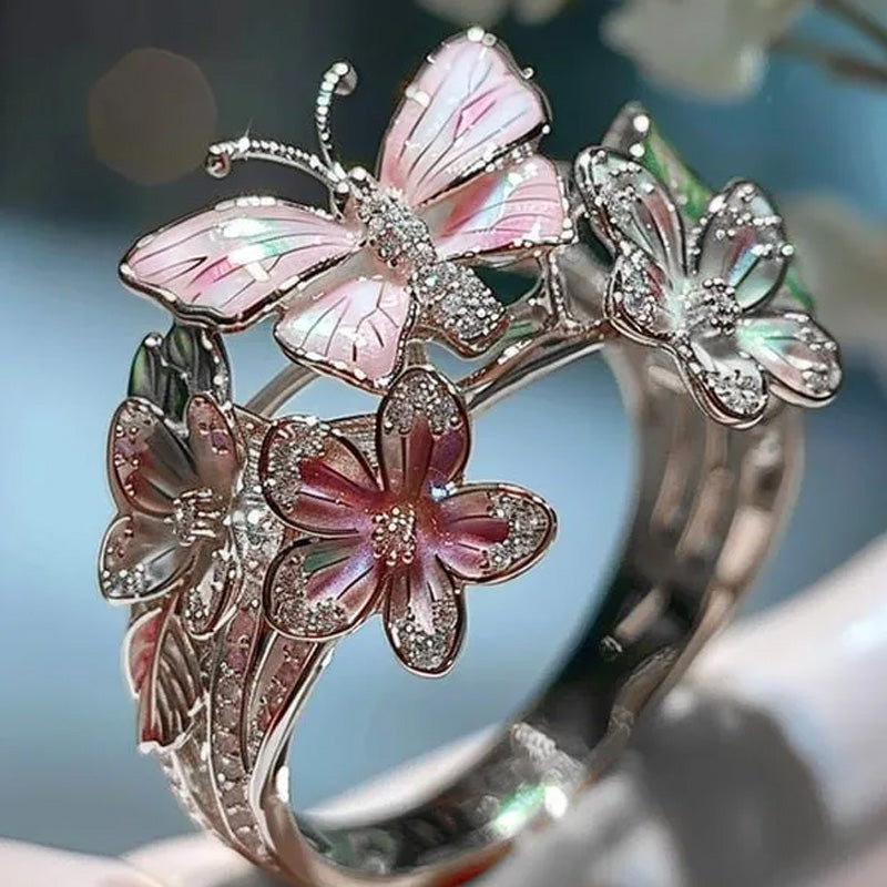 FASHIONABLE DESIGN: Det unikke design med sommerfugle og blomster gør denne ring til en trendy accessory. Den er perfekt til modebevidste personer, der ønsker at udtrykke deres stil med et strejf af naturens skønhed.