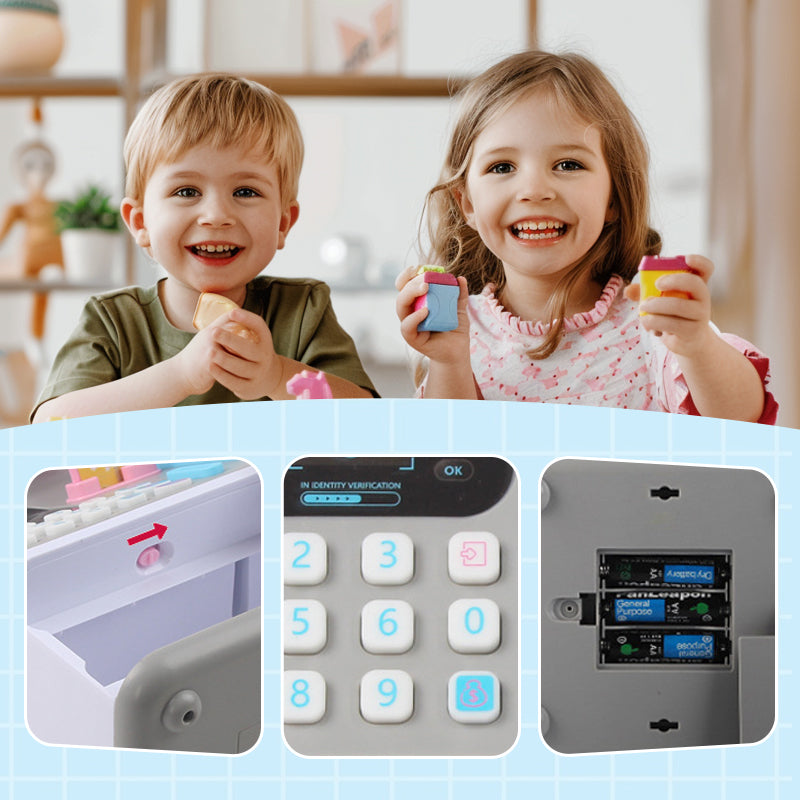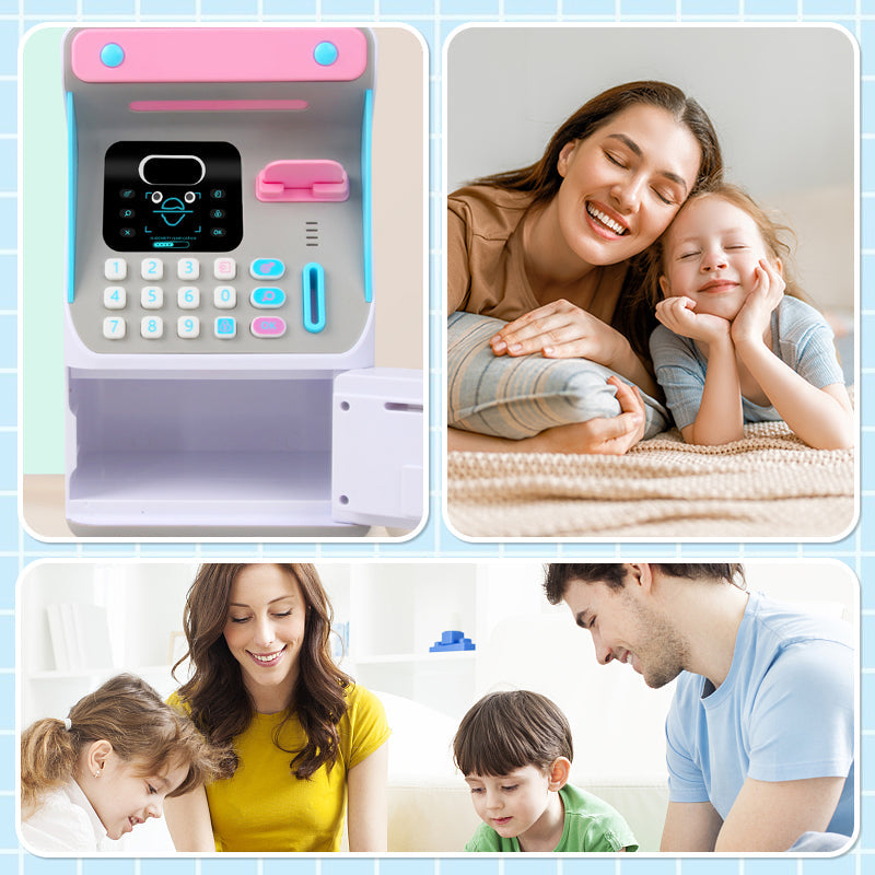 AUTOMATISK PENGEINDSKUD: Designet med en automatisk åbning, der trækker papirpenge ind, når den registreres, og efterligner en rigtig pengeautomat, hvilket opmuntrer børn til at gemme deres lommepenge på en sjov og interaktiv måde.