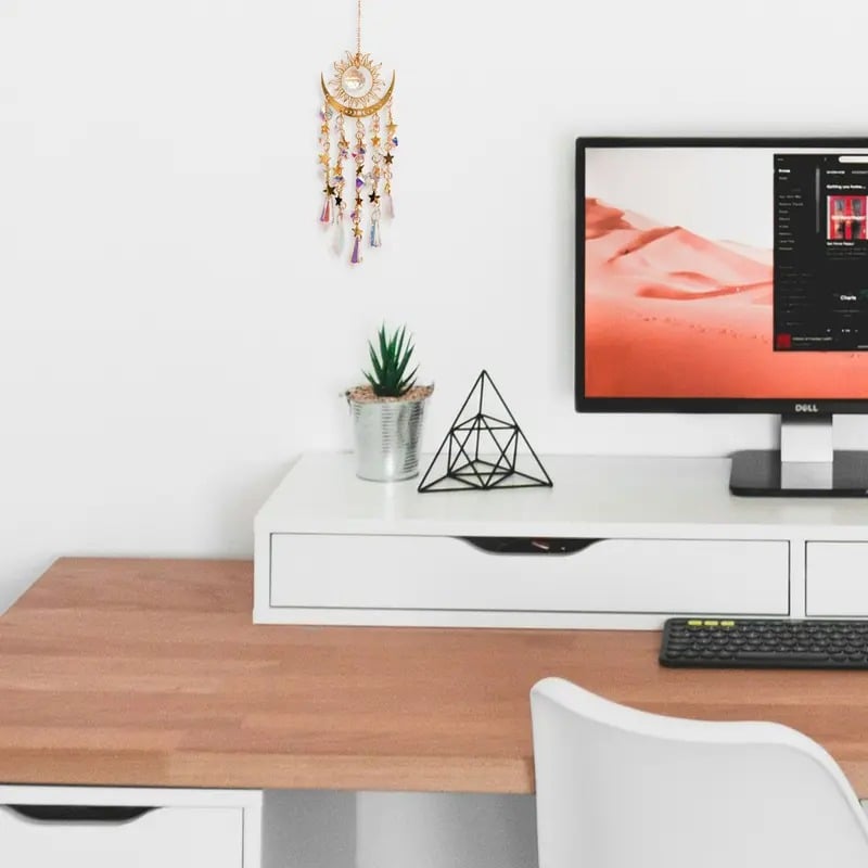 🌈Rainbow Maker: Suncatcher har en skinnende metalramme med sol-, måne- og stjernemønstre. Kunstige krystaller og vedhæng fanger sollyset og skaber en drømmende lys-skygge-effekt. Det unikke design, det fine håndværk og den stærke dekorativitet gør det til et fængslende kunstværk.
