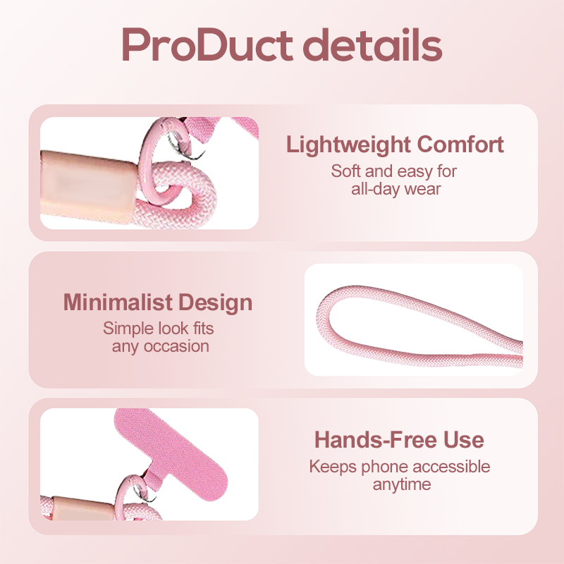 HOLDBAR KONSTRUKTION – Snoren er designet med styrke i tankerne og understøtter din telefon sikkert for at reducere risikoen for fald og ulykker. Dens robuste konstruktion modstår dagligt slid, hvilket giver dig tillid i både travle bymiljøer og udendørs aktiviteter. Materialet sikrer pålidelig ydeevne, samtidig med at det bevarer en let og behagelig fornemmelse under brug.
