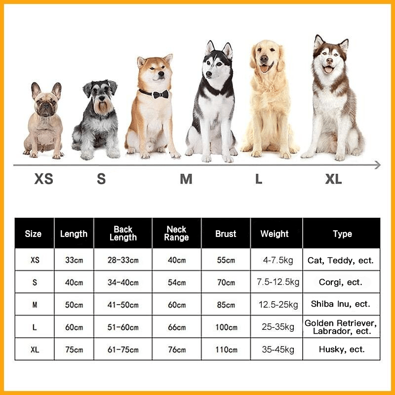 Fås i 7 størrelser fra XS til 3XL og passer til små, mellemstore og store hunde og katte. Den runde bryst- og halsåbning kan justeres for bedre at dække kæledyrets krop.