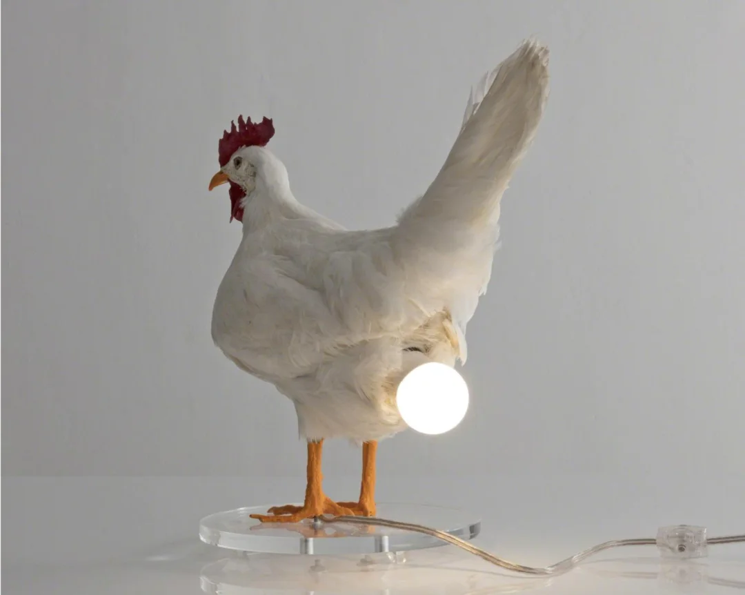 Den usædvanlige kyllingelampe med en æggepære blev designet og skabt af Sebastian Errazuriz i 2023. Sebastian Errazuriz er kendt for sine unikke kunstværker, hvor han bruger ægte udstoppede dyr. Hans andre bemærkelsesværdige kreationer omfatter et pindsvineskab og adskillige andre kreationer med en udstoppet kylling.