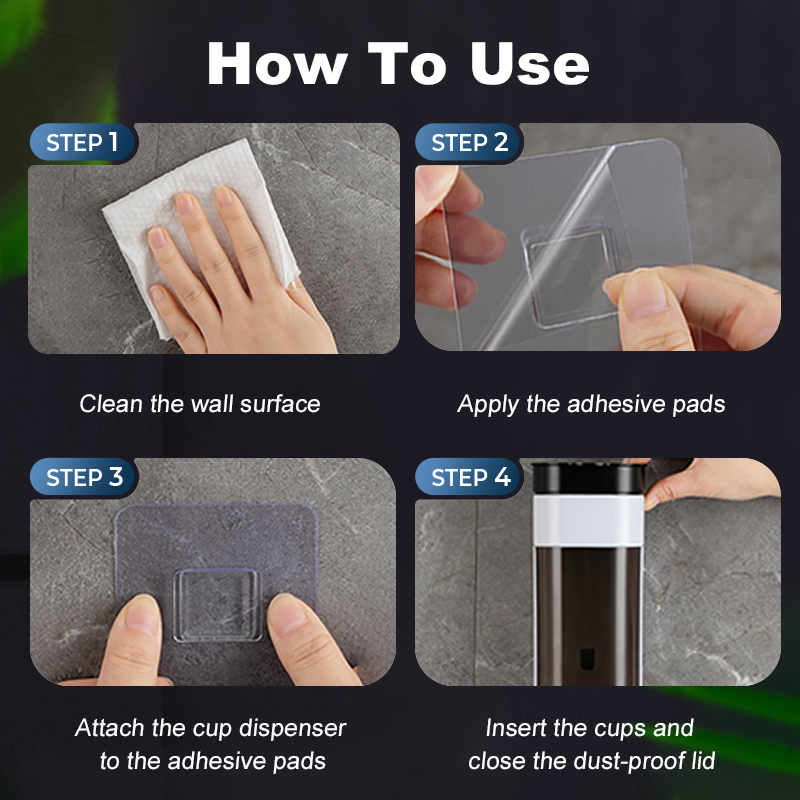INSTALLATION UDEN BORING - Installer nemt med klæbepuder uden bor, som fastgøres sikkert til vægge eller glatte overflader uden at forårsage skade. Dispenseren kan monteres hvor som helst, hvilket giver en problemfri installationsproces.