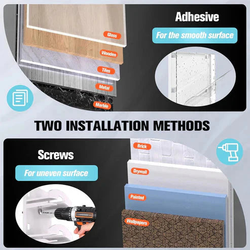 Vores selvklæbende baseball cap organizer kan monteres på glatte overflader som skabe, døre, marmor, fliser og endda køleskabe! Til ru overflader som malede vægge eller betonvægge skal du blot bruge skruer for at få en sikker pasform. Det er den perfekte løsning til at skabe ekstra opbevaringsplads i begrænsede områder! 🏠💼