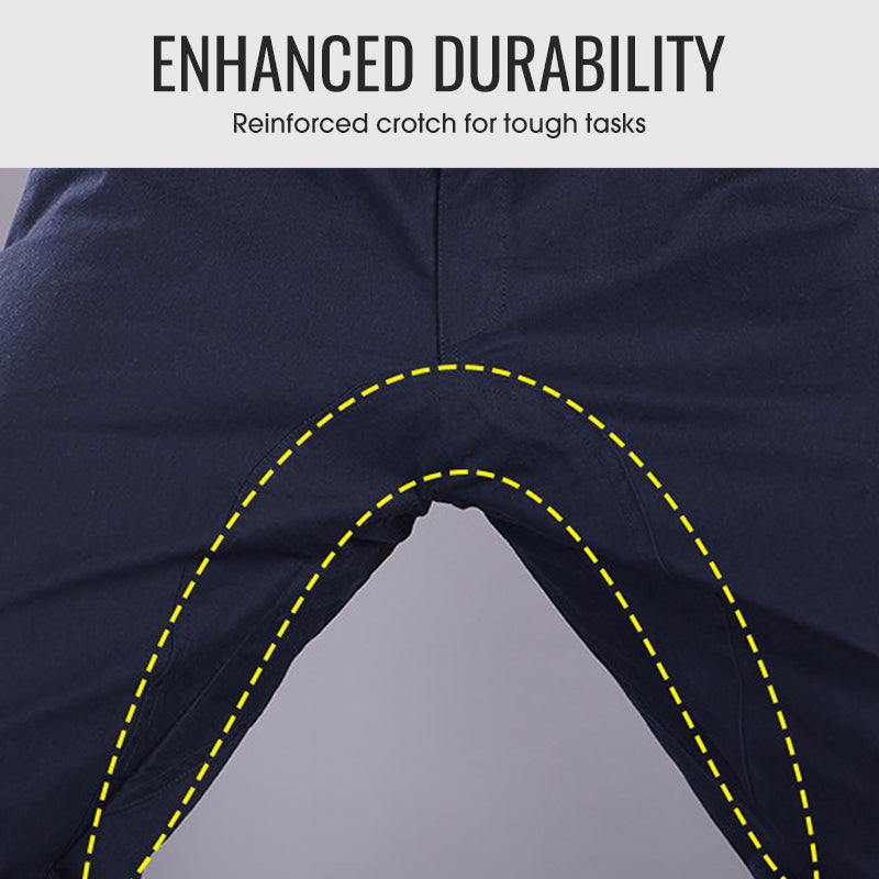 OPGRADERET DOBBELTLAGS FORSTÆRKET SKRIDT: Det dobbeltlags forstærkede skridtdesign sikrer ekstra holdbarhed, især under krævende opgaver. Denne forbedring øger modstandsdygtigheden over for rifter og slid, hvilket gør bukserne perfekte til knæling, strækning og gentagne bevægelser.